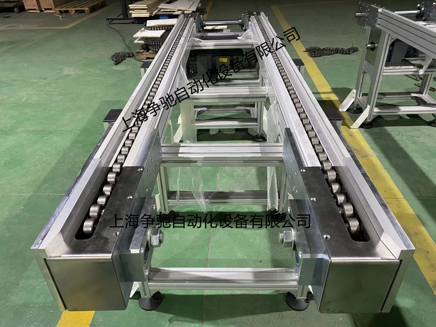 倍速鏈輸送機,其輸送原理是運用倍速鏈條的增速功能,使其上承托貨物的工裝板快速運行,通過阻擋器停止于相應(yīng)的操作位置;或通過相應(yīng)指令來完成積放動作及移行、轉(zhuǎn)位、專線等功能。