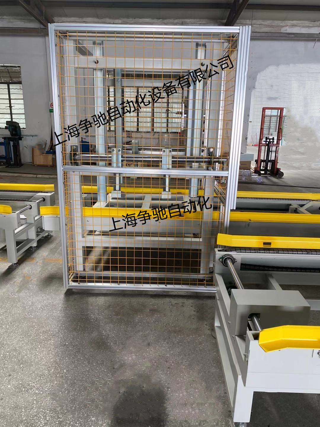 平板上工件符合棧板要求的一層工件,平板及工件向前移動直至棧板垂直面。上方擋料桿下降,另三方定位擋桿起動夾緊,此時平板復位。各工件下降到棧板平面,棧板平面與平板底面相距10mm,棧板下降一個工件高度。往復上述直到棧板堆碼達到設定要求。