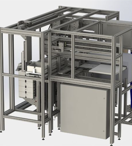 平板上工件符合棧板要求的一層工件,平板及工件向前移動直至棧板垂直面。上方擋料桿下降,另三方定位擋桿起動夾緊,此時平板復位。各工件下降到棧板平面,棧板平面與平板底面相距10mm,棧板下降一個工件高度。往復上述直到棧板堆碼達到設定要求。