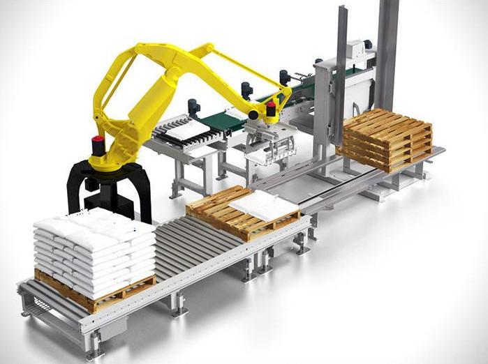 碼垛機是將已裝入容器的紙箱,按一定排列碼放在托盤、棧板(木質、塑膠)上,進行自動堆碼,可堆碼多層,然后推出,便于叉車運至倉庫儲存。本設備采用PLC+觸摸屏控制,實現智能化操作管理,簡便、易掌握。可大大地減少勞動力和降低勞動強度。碼垛機是輸送機輸送來的料袋、紙箱或是其它包裝材料按照客戶工藝要求的工作方式自動堆疊成垛,并將成垛的物料進行輸送的設備。