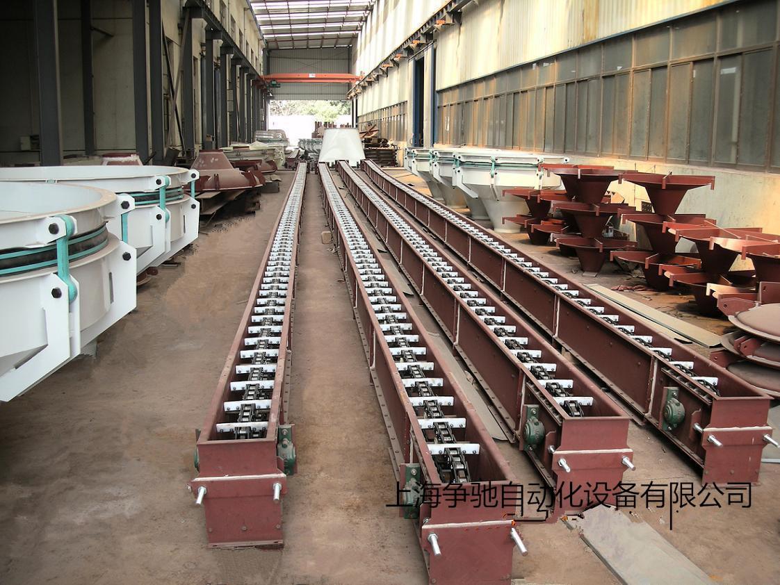 此外,還有供推移輸送機用的液壓千斤頂裝置和緊鏈時用的緊鏈器等附屬部件。機頭部由機頭架、電動機、液力偶合器、減速器及鏈輪等件組成。中部由過渡槽、中部槽、鏈條和刮板等件組成。機尾部是供刮板鏈返回的裝置。重型刮板輸送機的機尾與機頭一樣,也設有動力傳動裝置,從安設的位置來區分叫上機頭與下機頭。