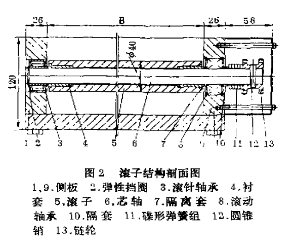 圖1是滾筒輸送機(jī)的縱向布置圖,它是由滾子1、鏈輪2、鏈條3、左右側(cè)板4和減速器5等組成。圖2是滾子結(jié)構(gòu)的剖面圖,其中碟形彈簧組1既起傳遞扭矩的作用,又起過(guò)載保護(hù)作用,當(dāng)輸送線上局部滾子受阻不易旋轉(zhuǎn)時(shí),碟形彈簧片之間打滑,其它滾子可照常運(yùn)轉(zhuǎn)。滾子5兩端內(nèi)孔中裝有襯套4,套裝在芯軸6上,芯軸8與兩邊側(cè)板1、9中的滾針軸承3和可承受軸向力的滾動(dòng)軸承8的配合分別是H7門(mén)h6和H7/f7,芯軸6兩端分別裝有彈性擋圈2和鏈輪13,芯軸在碟形彈簧組預(yù)壓力作用下,始終向鏈輪方向拉緊,因而使左端滾針軸承內(nèi)圈與滾子5一端襯套4端面緊密貼合,右端通過(guò)兩個(gè)厚度為2mm的隔離套7同滾動(dòng)軸承8內(nèi)閣緊密貼合。由于這種緊密貼合產(chǎn)生摩擦力、使?jié)L子5同芯軸6同步旋轉(zhuǎn)。當(dāng)?shù)捵由系呢?fù)載力大于摩擦力時(shí),滾子停轉(zhuǎn),而芯軸在鏈輪13的帶動(dòng)下繼續(xù)運(yùn)轉(zhuǎn)。調(diào)整隔離套10的厚度可得所需磲簧預(yù)壓力、調(diào)整時(shí)應(yīng)不允許鏈輪與鏈條在運(yùn)轉(zhuǎn)時(shí)存在別勁現(xiàn)象。