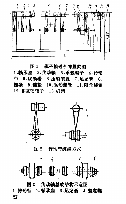 驅動式滾筒輸送機長度L分別為6240mm、5740mm、6740mm、5840mm,高度為1155mm,寬度為712mm,有效輸送寬度420mm,電動機功率550W,輸送速度03m/8,輥子間距150mm。輸送機布置示意圖見圖1,驅動裝置10位于輸送輥子的下方,用傳動鏈條8帶動傳動軸2端部的鏈輪9。聯軸器5將各段傳動軸聯成一根貫穿輸送機全長的傳動軸,承載輥子3的軸端支承在機架13的縱向橫梁U形槽中。傳動帶4繞過緊套在傳動軸上的尼龍套7和支承輥子的溝槽(參看圖2),帶動支承輥子旋轉,每根傳動帶由一個安裝在機架上的壓緊裝置6壓緊,保持傳動帶的張力。限位裝置11安裝在輸送機端部的兩個非驅動輥子12之間,對輸送的件貨起暫時存儲作用。
