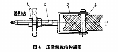 (3)壓緊裝置參看圖4,該裝置用兩個調節螺母1固定在機架上,銷軸4將壓緊輪3和螺桿架2聯成一體,由螺母1調整壓緊輪3對傳動帶的壓緊力。
