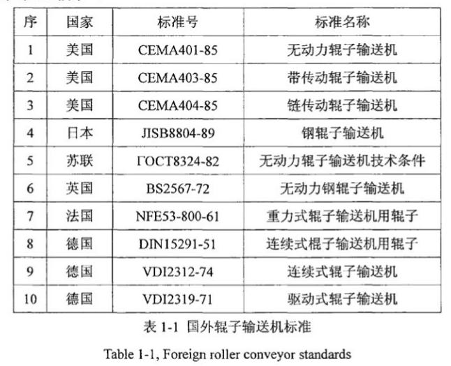 滾筒輸送機制造業發展迅速,各種結構形式的滾筒輸送機已經在生產中得到廣泛應用,前蘇聯、美國、德國、日本等工業發達國家在滾筒輸送機的研究方面都有一定的進展。近年來滾筒輸送機的制造技術早已進入了成熟階段,并形成了專業化和規模化的生產,它的通用和專用產品均有較多的類型,規格品種比較齊全,而且結構型式多種多樣,因此可以滿足各行各業生產的需要。同時,這些國家也十分重視滾筒輸送機的標準化工作,從二十世紀五十年代起,這些國家就開始投身于制定滾筒輸送機標準的工作,經過不斷地更新和完善,實現了規范并推動滾筒輸送機在生產制造中的標準化、系列化和通用化的目的,而且保證和促進了滾筒輸送機的制造質量和技術水平。國外輥子輸送機標準見表1.1所示。